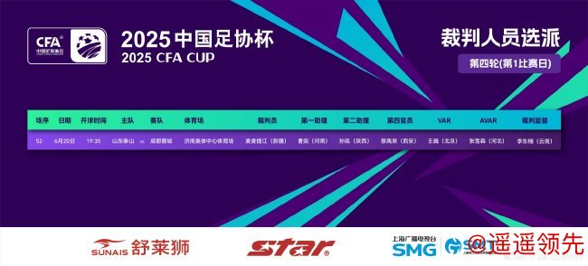 北京时间6月20日19:35,足协杯1/8决赛,开云体育app壹号娱乐APP山东泰山坐镇主场济南奥体对阵成都蓉城,麦麦提江将执法本场比赛!